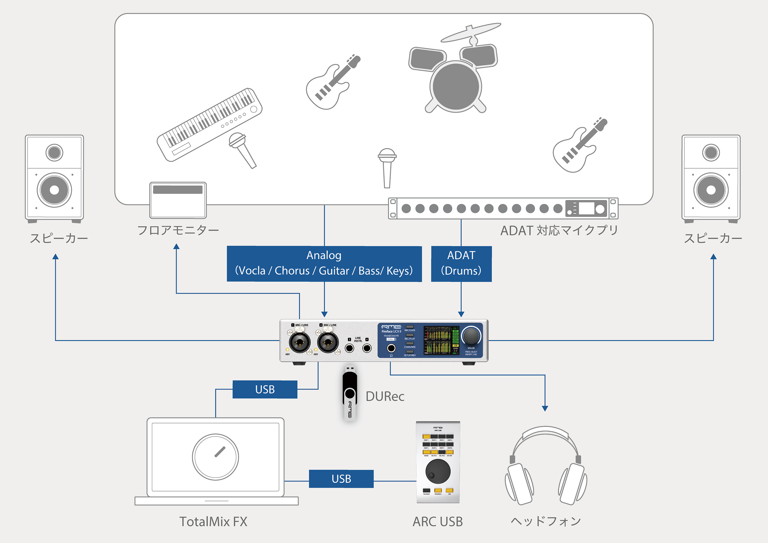 スタンドアローン動作 × DURecで、PCなしでもUSBメモリにライブ録音できるため、本番中のバックアップとしても安心です。