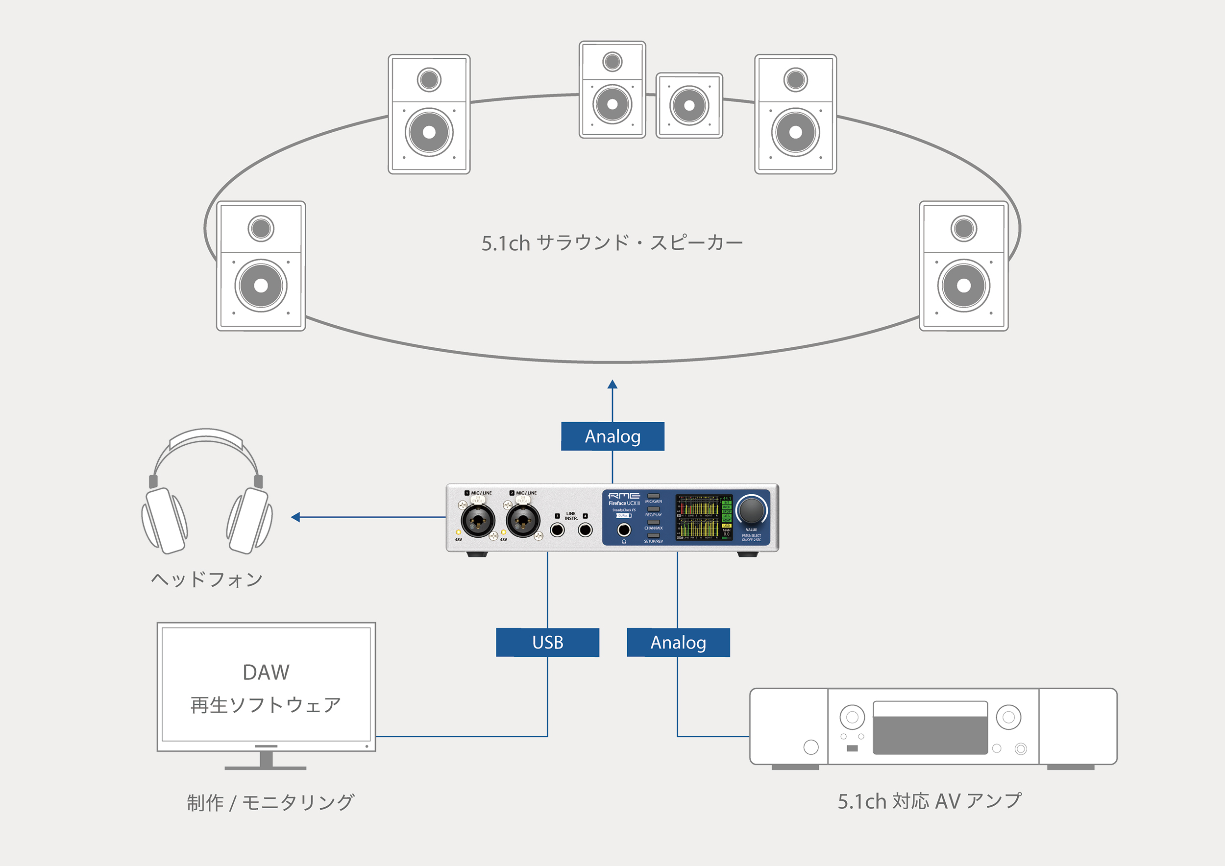 RMEならではの高い安定性と精度で、5.1chサラウンドや5.1.2chイマーシブといったマルチチャンネル・モニター環境にも対応し、シンプルかつ高品位な空間オーディオ体験をサポートします。